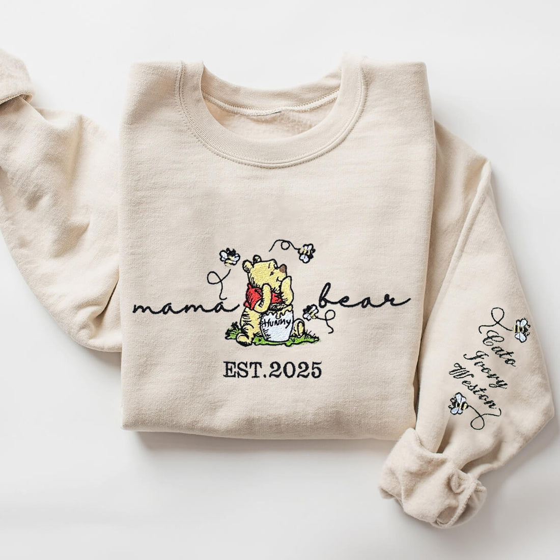 Personalized Embroidered Mama Bear Shirt With Kids Names Sleeve