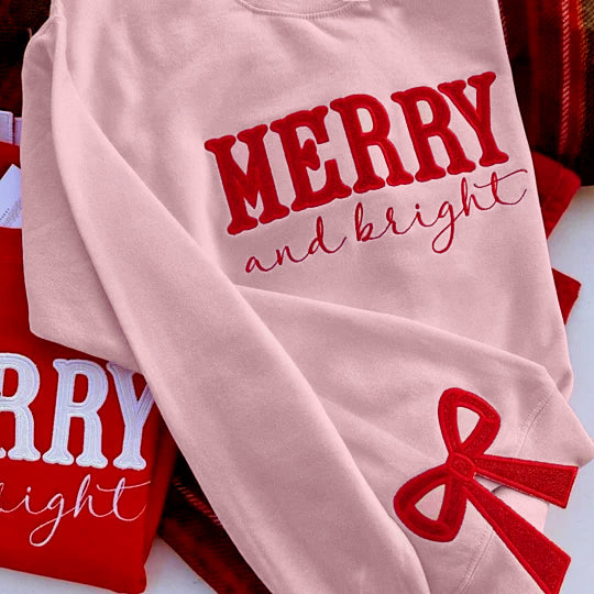 Embroidered Merry Glitter Christmas Bow Embellished Sweatshirt – Custom Side Bow Cut-Out Sweatshirt