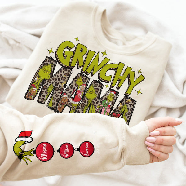 Custom Mommy Grinch Sweatshirt With Kids Names On Sleeve