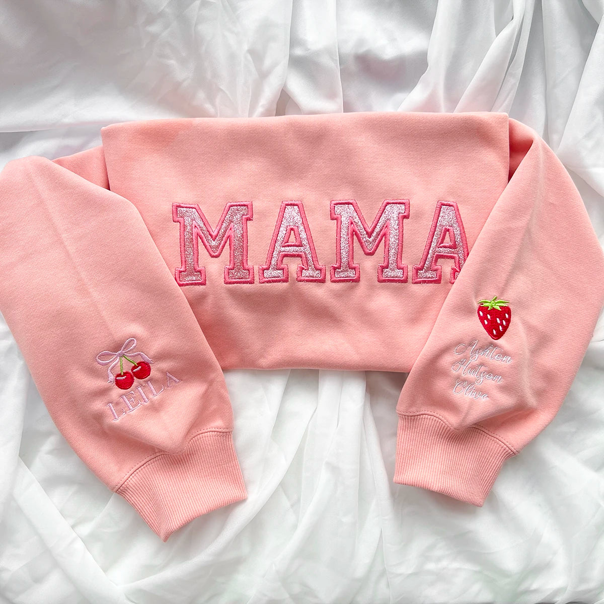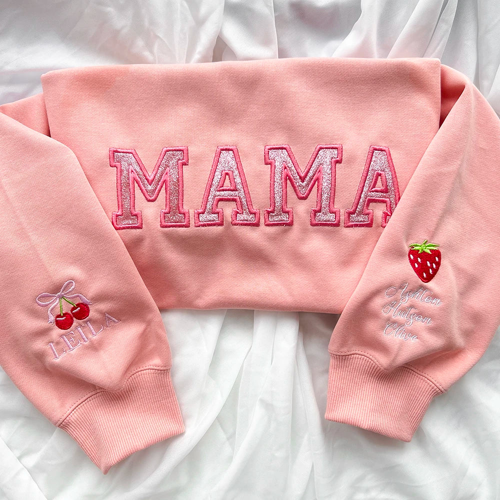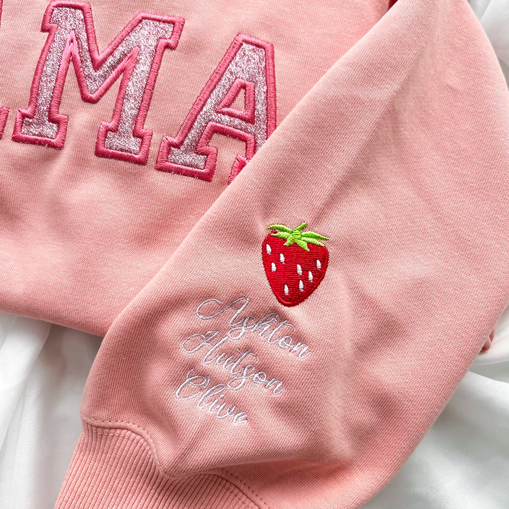💖Custom MAMA Pink Strawberry Glittered Sweatshirt - With Kids Names On Sleeve - Gift for Mom & Grandma.💖