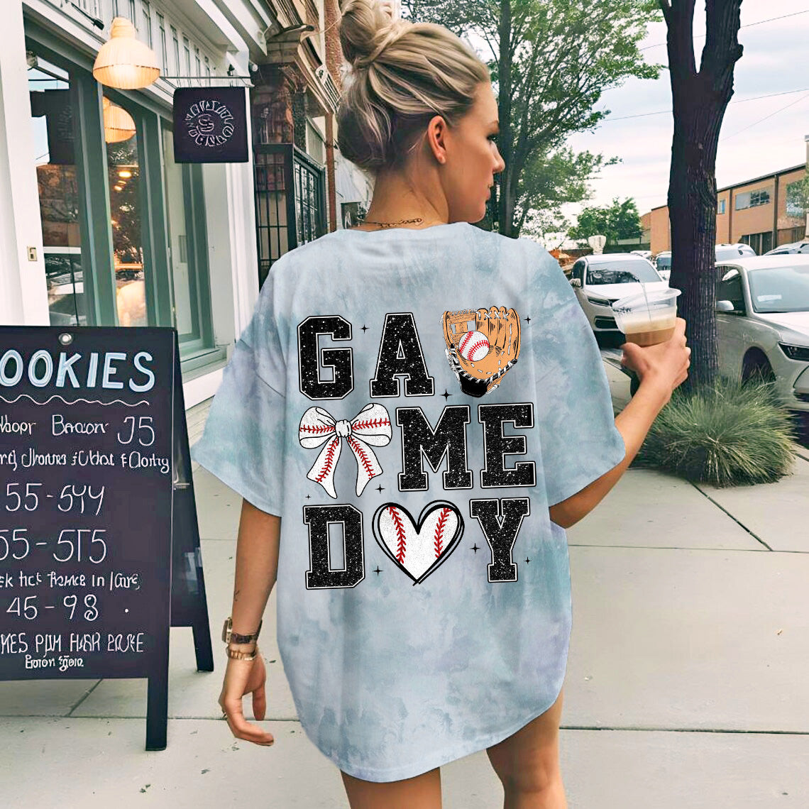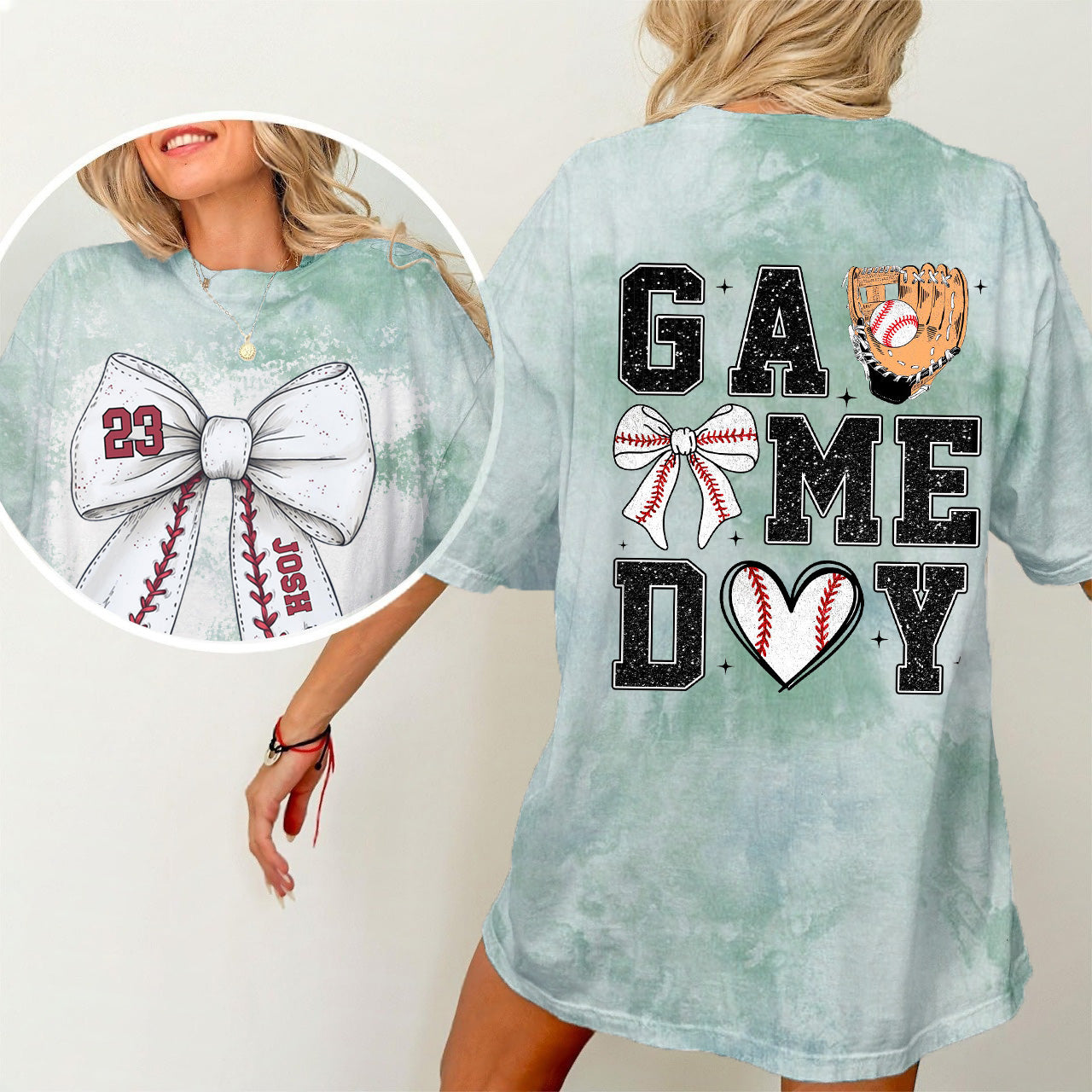 💖Personalized Baseball Bow Game Day Watercolor Tie-Dye T-Shirt - For Cheer Family