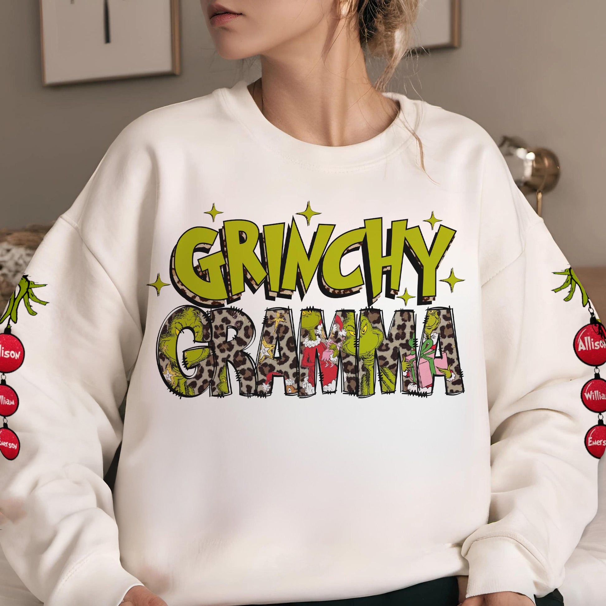 Elevate your Mama/Nana style with our Custom Christmas Grinch Sweatshirt - Personalize the back with the names of the children and/or loved ones to make it even more special.