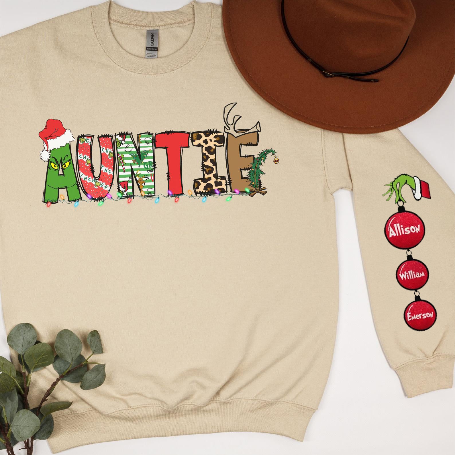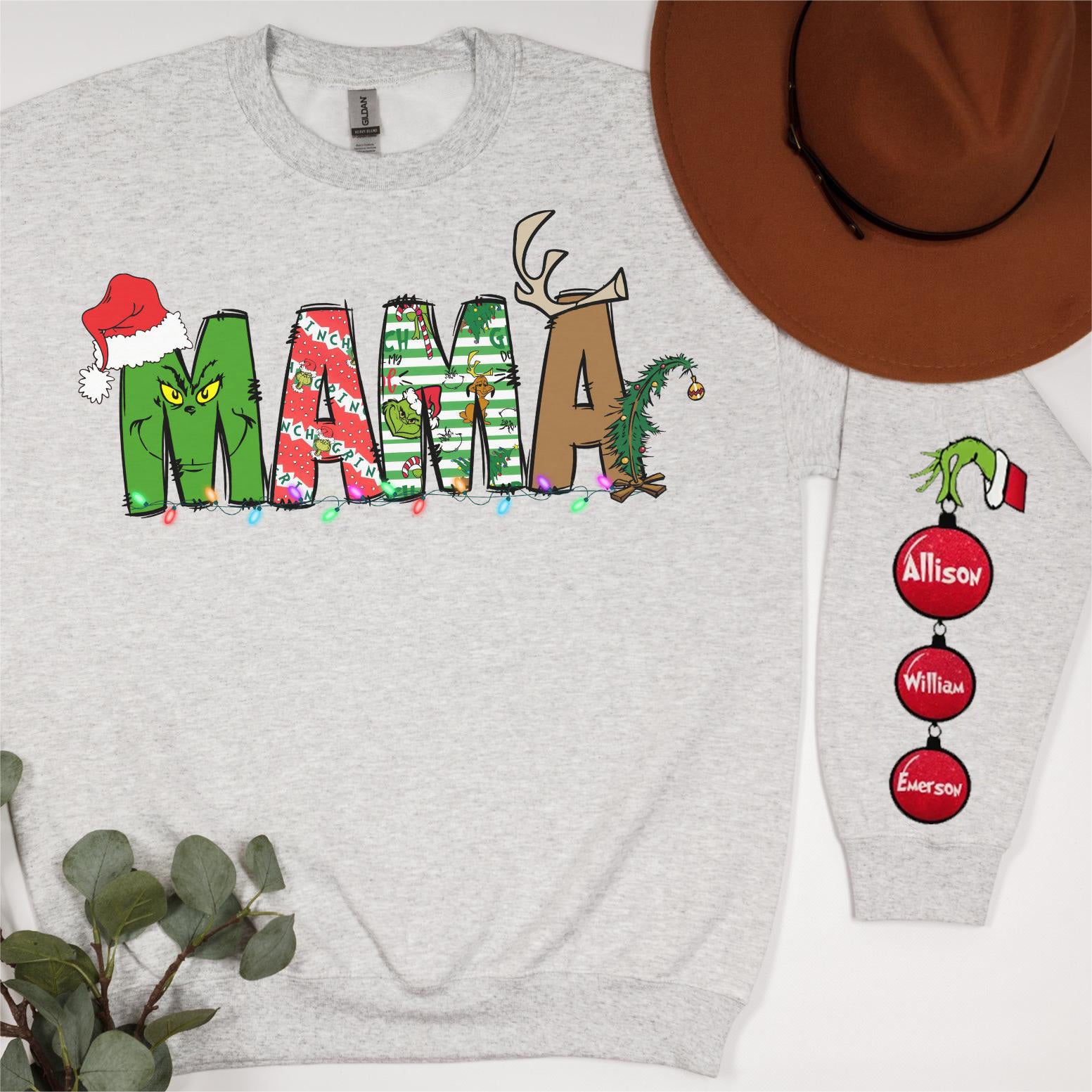 Elevate your Mama/Nana style with our Custom Christmas Grinch Sweatshirt - Personalize the back with the names of the children and/or loved ones to make it even more special.