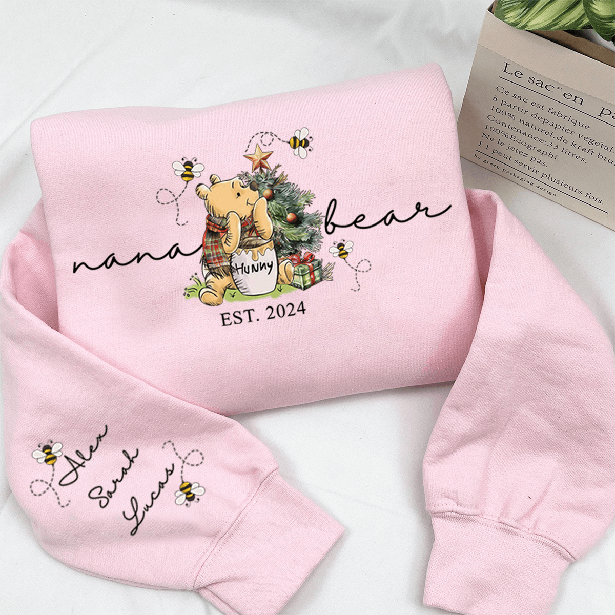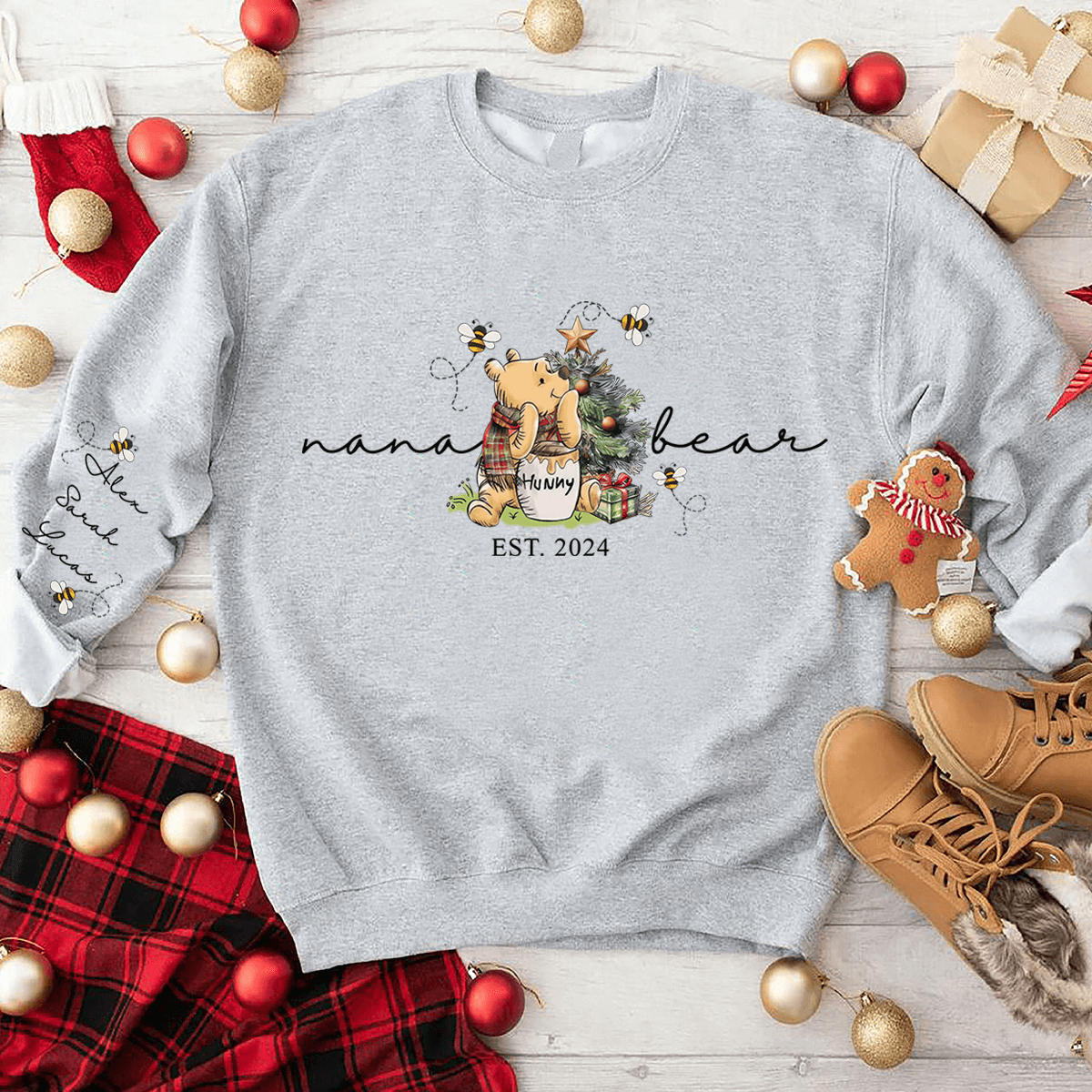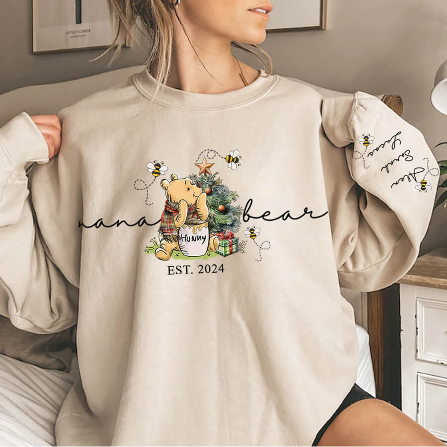 💖Personalized Mama Bear Granny Bear with Xmas Tree Tee/Sweatshirt - Customized Kids' Name On Sleeve